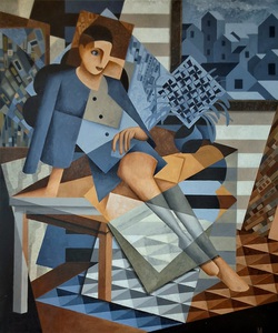Uit een spel van doorlopende lijnen verschijnt een collage van kleurvlakken. Tezamen vormen de vlakken een gestileerde Man met een blauwe Hoed.